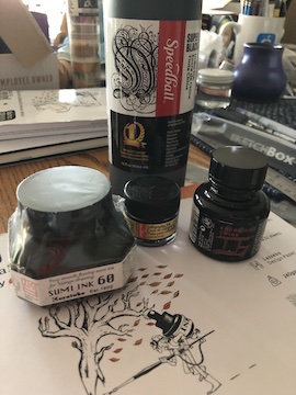 I got a Sennelier black India ink in this month’s SketchBox. I am excited to try that. Last year I got carried away and realized you could buy India ink by the pint and I got a pint of Speedball Super Black ink for $13. I also have over the years accumulated a collection of various Sumi black inks that are used in manga. I haven’t used them yet, so I would like to try a few things to see what I like using best.