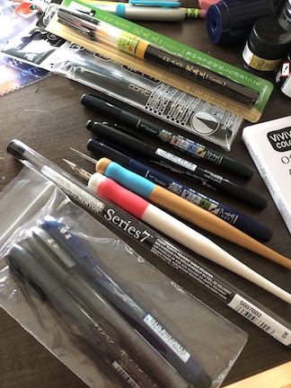 I also have several dip pens. I went out and bought the actual nibs that manga artists use for their work. There are three sizes that all have different characteristics. The more common one to find is the G nib, which tends to be used for more bold and dynamic manga. I also have a maru nib on the brown nib holder because it was tiny and got stuck on the holder and if I want to remove it I will wind up destroying it with pliers, so it stays until I break it.